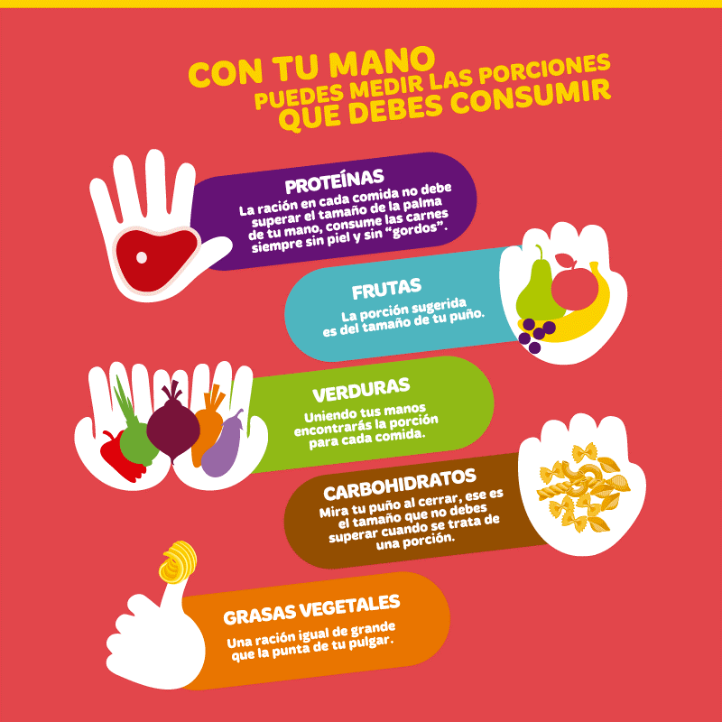 - La palma de la mano: el tamaño de porción para proteína animal. Ej.: carne, pollo, pescado, huevo, etc.