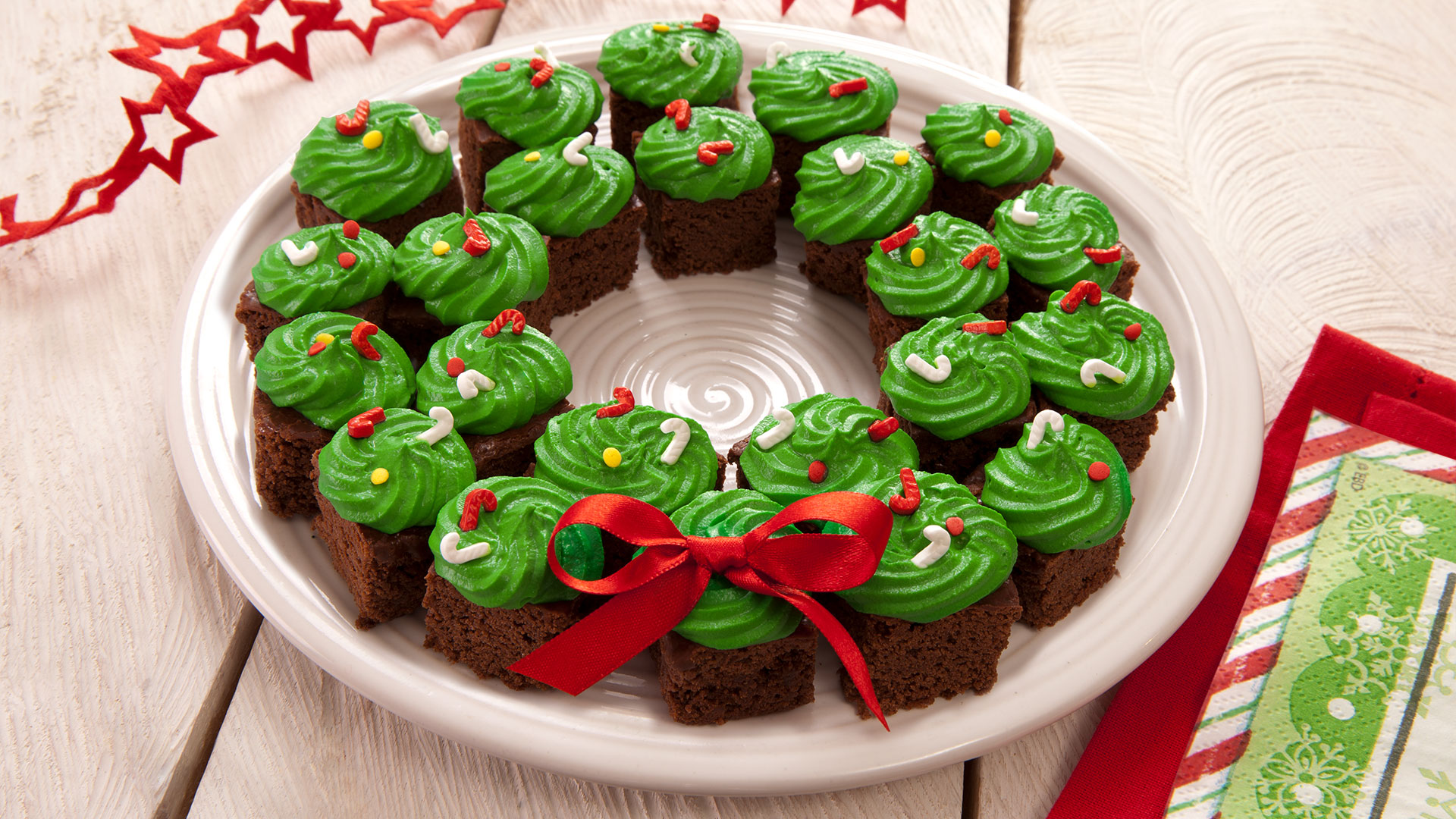 En un plato, organice los mini-brownies en forma de corona de navidad.