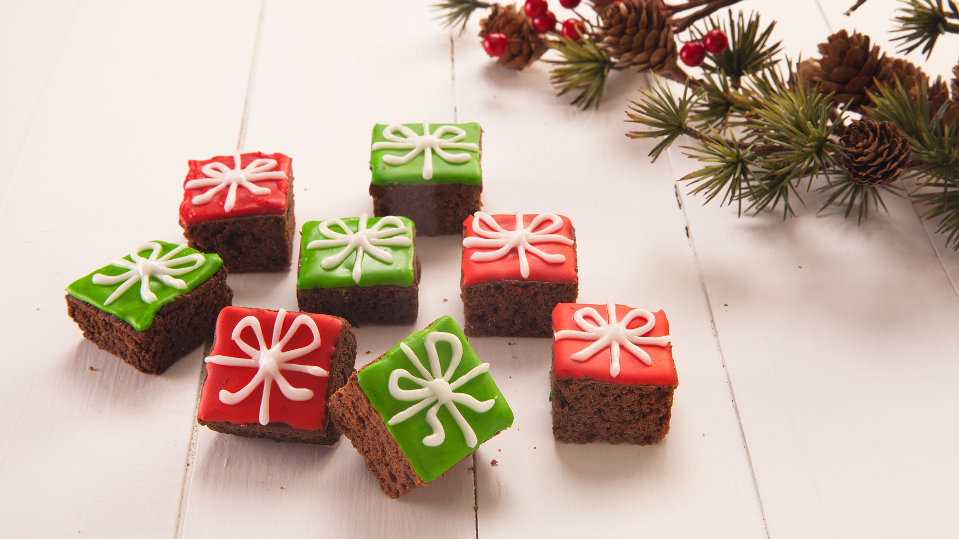 Con la ayuda de un cuchillo esparza una capa de glaseado rojo o verde sobre los mini brownies.