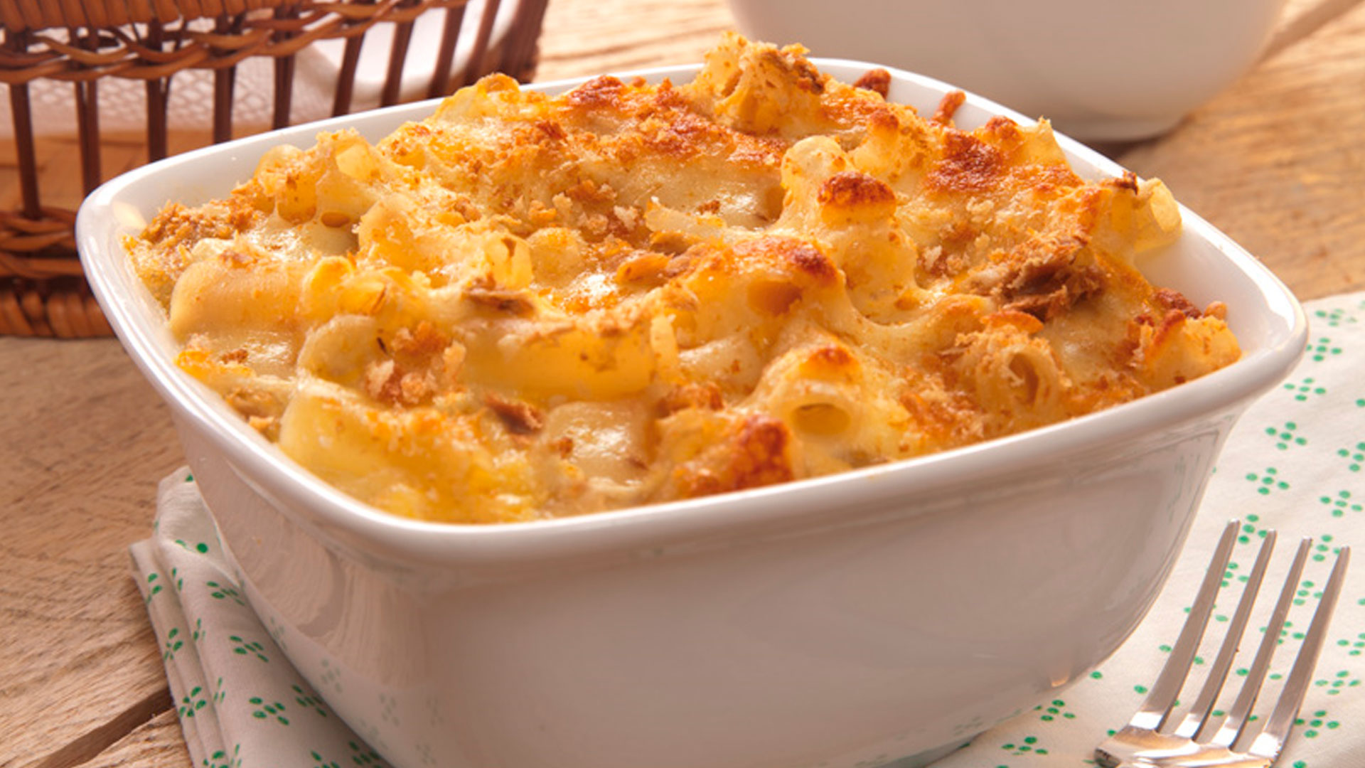 Engrase un molde para horno con la margarina. Vierta la mezcla de pasta y atún. Rocíe con el resto del queso mozzarella y la miga de pan.